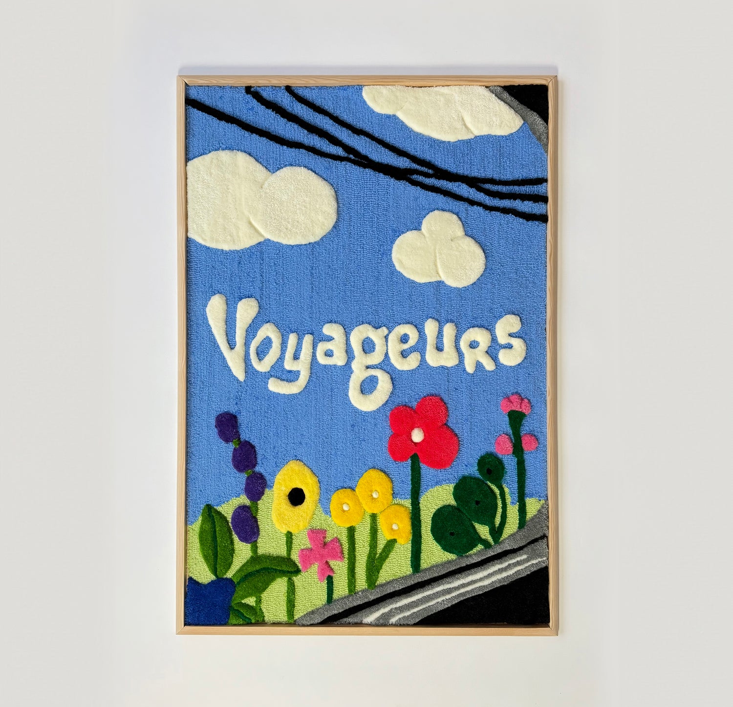Invitée par SNCF Voyageurs à réinterpréter le mot « Voyageurs », j’ai cherché à représenter ce que le voyage évoque pour moi : un moment suspendu, entre mouvement et rêverie. Petite, je passais des heures à observer les paysages et les fils électriques défiler derrière la vitre du train. Cette sensation de calme et de curiosité m’a inspirée pour cette œuvre textile, imaginée comme une parenthèse contemplative.